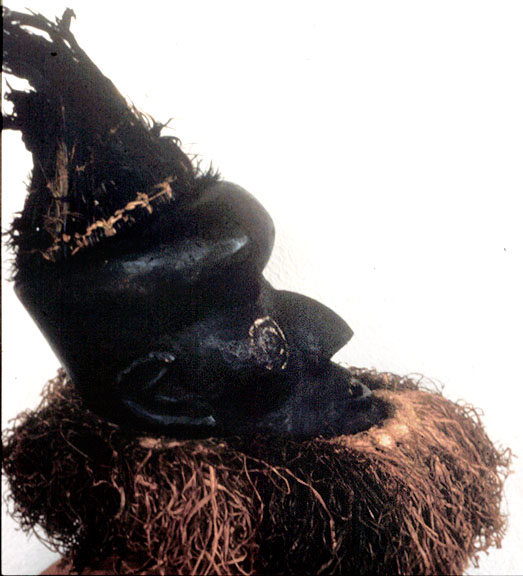 This wood helmet mask, Bwoom variant, has feather and raffia attachments, and a darkened surface.