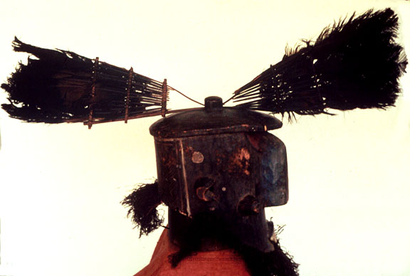- This wood helmet mask has a carved guilloche design on the back, double feather attachment, and a darkened surface with traces of tukula and kaolin.