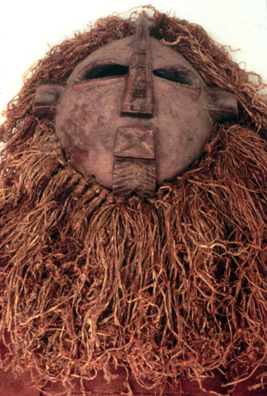 This wood face mask, Kifwebe, has pigment and raffia attachments.