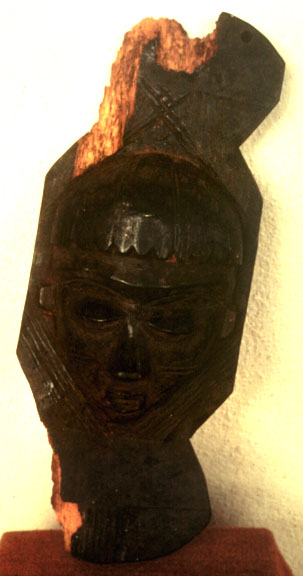 This wood plaque, with a Mbuya mask in relief, has a darkened surface.
