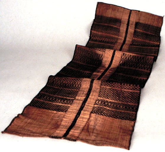 This woven raffia loincloth from the Mbole of Zaire has brown geometric designs.