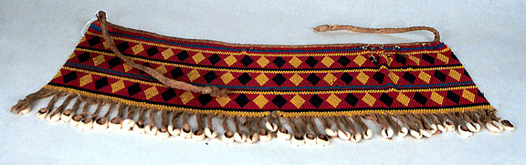 This multi-colored beaded skirt has three rows of triangles and cowrie shell suspensions.