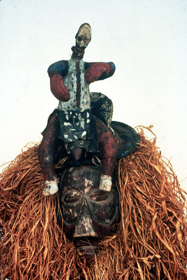 This wood kholuka mask is surmounted by a seated male figure, and has pigments and raffia suspensions.