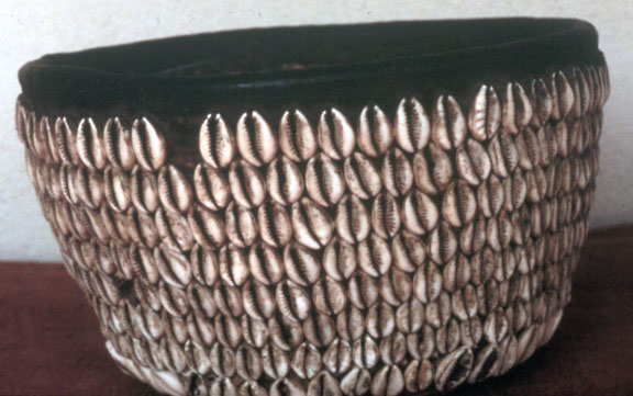 This fiber basket is covered in leather and decorated overall with cowrie shells.