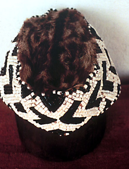 This Mobutu style hat has fur decoration and geometric beadwork.