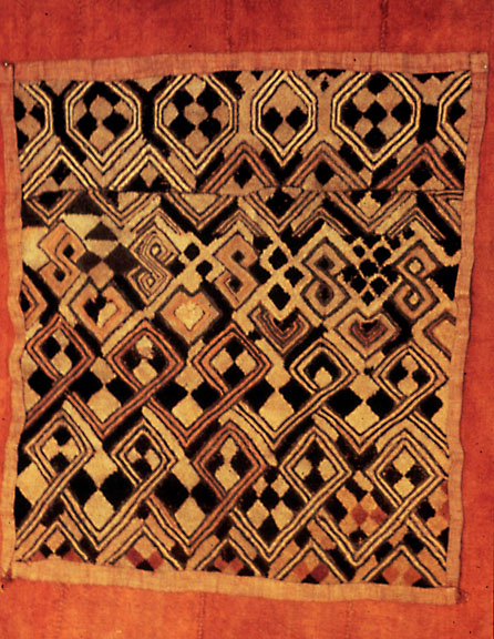 This cut-pile textile has closely-set, tight embroidery in brown and cream geometric designs. They are known as Kasai velvets, woven of raffia palm fiber that has been soaked and beaten to create the velvet-like texture. Once the cloth was woven by men on a small loom, women embroidered it with designs that transmitted information about family history, myths, and moral lessons. Such cloths were used to cover the king's throne or placed under his feet, or as dowries and burial cloths.