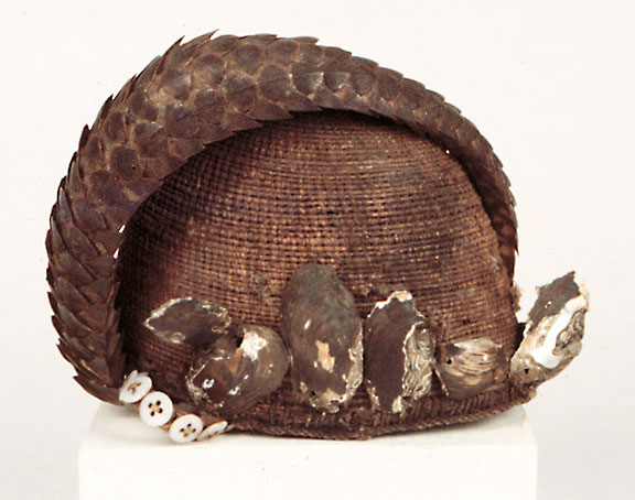 This Lega hat from The Democratic Republic of the Congo, formally Zaire. It has pangolin scales and shells. It is from the Lega Culture.