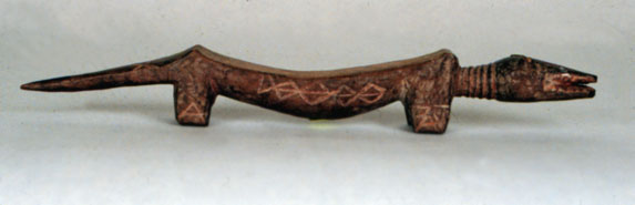 This Kuba wood divination animal, itoombwa, is of attenuated form, with carved designs and pigment. Made of wood, this "rubbing oracle" was used as a divination tool. The diviner rubbed the wooden attachment over the back of the animal figure. If it stuck, the person was guilty. "A crocodile never lies" was a local saying. This piece appears to be a crocodile, simplified and abstracted, with notched teeth and a long tail. Representative Kuba diamond designs are carved on the side, legs, and tail. Evidence of red pigment, possibly tukula powder, is visible in the recessed areas.