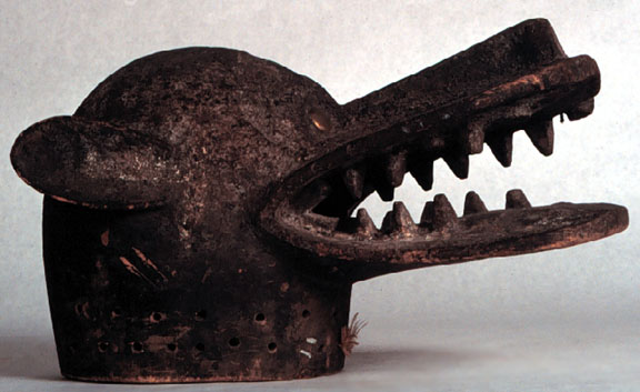 This mask, Chamba Senufo, Korubla, has heavy over-all encrustation, metal disk eyes, and blackened pigmentation. [Nigeria/Ivory Coast?]