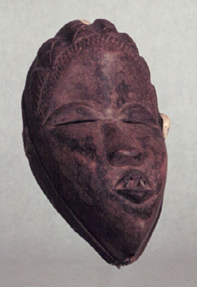 This Dan mask, with incised coiffure, forehead markings, protruding lips, metal teeth, cloth, and cowrie shells, has a brown use patina. On stand. [Liberia/Ivory Coast]