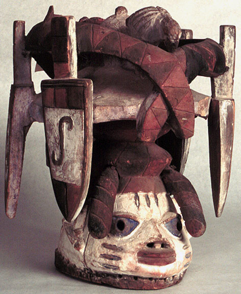 This Yoruba, Gelede society, headdress, with bird, snake and knives motif, is polychromed and has a fine patina. Wth stand.