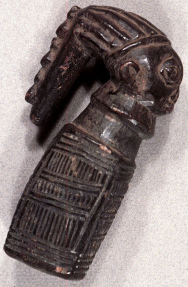This Yoruba Eshu figure was used by a priest as part of an elaborate costume worn when ere ibedji figures are blessed. It has sring earrings and a good patina.