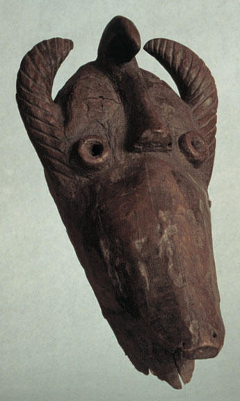 This Dan? Geh mask has grooved horns, a central bird, protruding cylindrical eyes, and a long open beak. It is an exceptionally fine old piece with a good old use patina. [Ivory Coast/Liberia]
