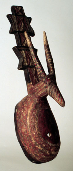 This Mossi wooden mask has a rounded, convex face with diminutive eyes and cross-hatched designs, surmounted by an antelope head and horns and by a cubistic superstructure behind, incised and polychromed. It has residual pigment and a fine use patina. ...