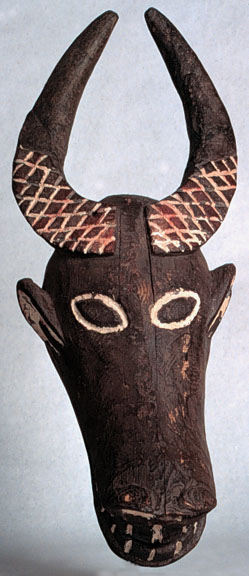 This Bamileke headdress from the Cameroonian grasslands, represents a bush cow with an open mouth and exaggerated teeth, incised in squares.