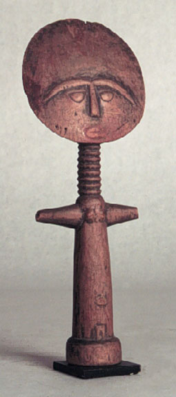 This Ashanti akua'ba fertility figure is well carved with a discoidal head and a fine handling patina. With base.