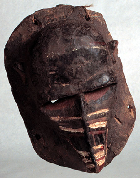 This anthropomorphic monkey mask, possibly Dan-Guere or Guro, on a socle, is crude, with horizontal lines across the face, and is polychromed, with a use patina. [Liberia/Ivory Coast]
