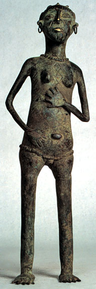 This female figure from the Cameroonian grasslands has hands attached to torso, and a bulbous body. It is hollow cast with imperfections, scarification, finely modelled details, and a good patina.