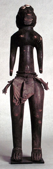 This Bobo standing female figure has attenuated, foreshortened arms and torso, cowrie shells, fur gri-gris, loin cloth, and a fine patina.