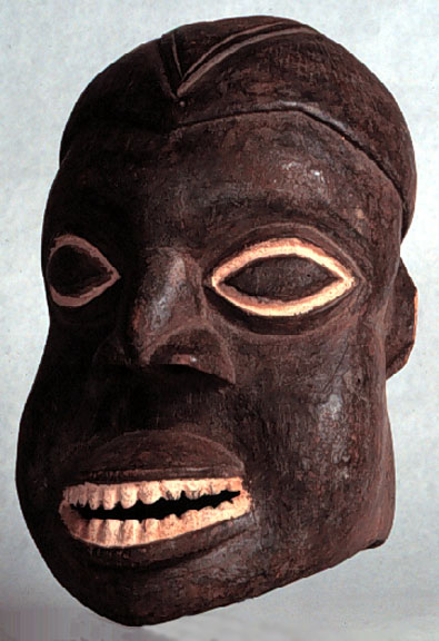 This Bamuni/Bakon helmet headdress from the Cameroun Grasslands has natural features, some linear scarification, kaolin around eyes and teeth. It is well carved, blackened, and has a fine old use patination.