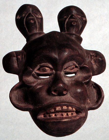 This mask, probably Ibibio, Ekpo Society, is surmounted by two heads, plus a head over each ear. It is well carved, with a fine patina.
