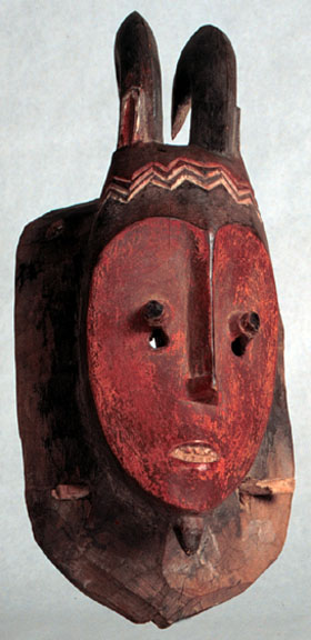 This anthropomorphic Guro mask has grooved horns, a beard, socle with mouth stick, and residual polychrome pigment.
