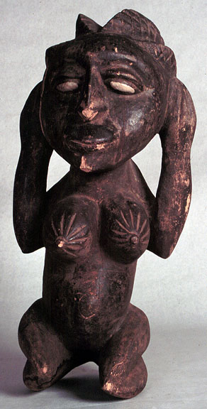 This pair of Bagga/Koronko squatting figures is well carved, with a good use patina and kaolin on the eyes. [A. Male has hands pointed under chin, elbows resting on knees, a patch of cloth on the head and back, cowrie shells on left wrist,and red bead...