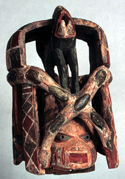 This polychromatic, Yoruba Gelede Society headdress with daggers, has a head surmounted by an elephant and a snake. It is well carved and has old use patination. With stand.