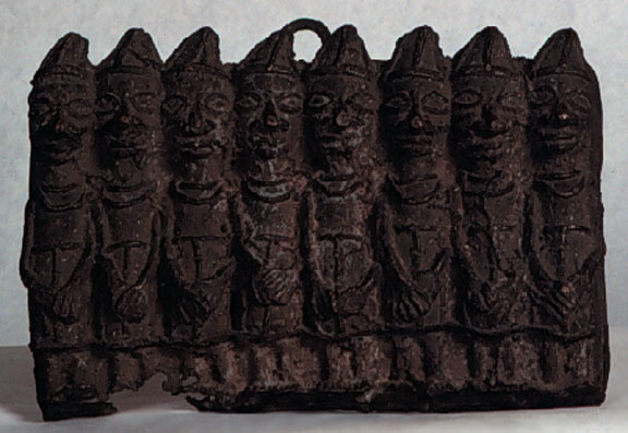 This Benin bronze plaque, with a central hook for handing, has eight more or less identical figures (priests or warriors) in a row. With stand.