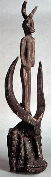 This Bambara zoomorphic mask/headdress with multiple animal features is a rare form. Rrising from center forehead is a pair of graceful sweeping horns. Behind is a standing horned figure. It has a fine use patina. With stand.