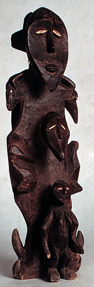 This Fang Bwami Society, Lega, shrine figure has a female figure on one side with additional projecting heads representing animals and birds. The other side has a single large projecting head surmounted by birds and animal heads. [Gabon/Zaire]