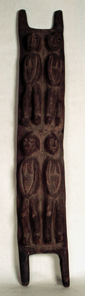 ThisBambara vertical door panel, with bottom right hinge has four full standing figures with tattoo scarification carved in relief. It is cracked.