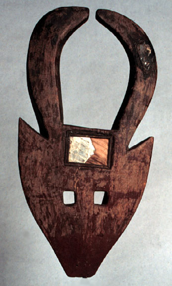 This Bobo (Gurunsi influence) mask has a flat face with triangular ears in the same plane, bull's horns, a mirror rectangle set into the forehead, square eye holes, and old use patination.