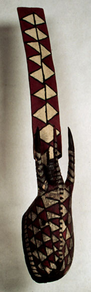 This Mossi mask, possibly Wango, has a superstructure with three horns, a vertical plank, and polychrome in red,black,and white triangular patterns.