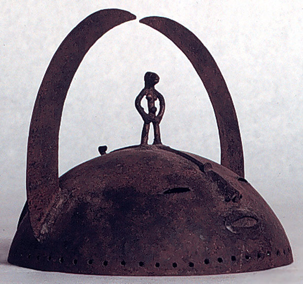 This Senufo metal helmet-style headdress was made as a simple cap for a dancer with side holes for attaching raffia. It has a pair of horns flanking a figure of a fertility goddess.