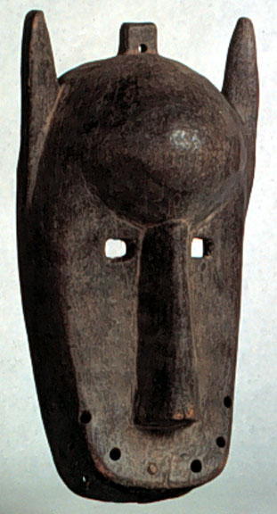 This anthropomorphic Bambara, Koro Society, mask from the Teuba region has animal lips open and pierced for feather swatches. It is well carved, with a fine patina.