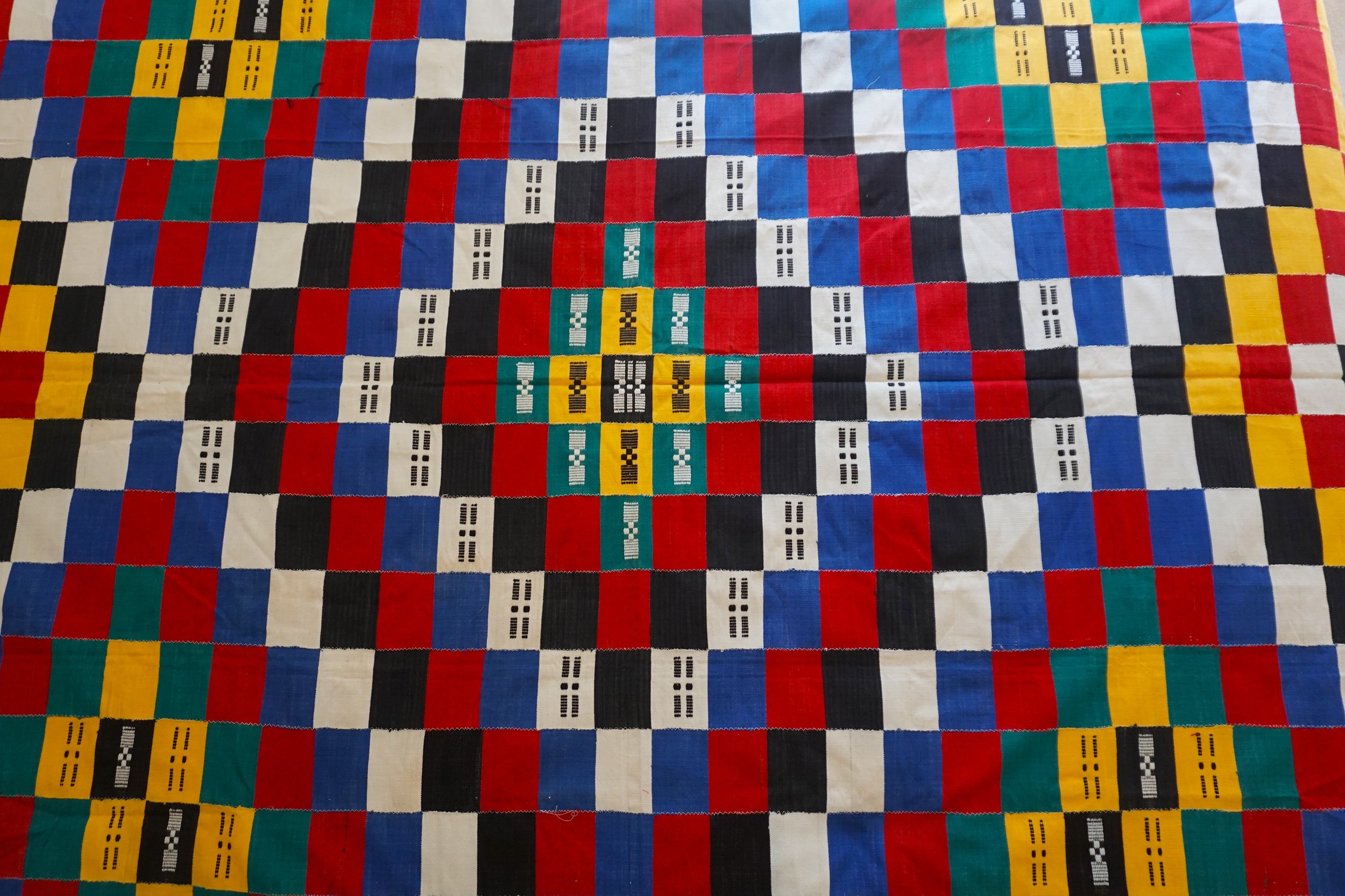 The blanket has repeated red, yellow, green, black and white rectangles produced in strips and sewn together to form a blanket. Black and white patterns are woven into some of the rectangles. The pattern of the blanket is unique.