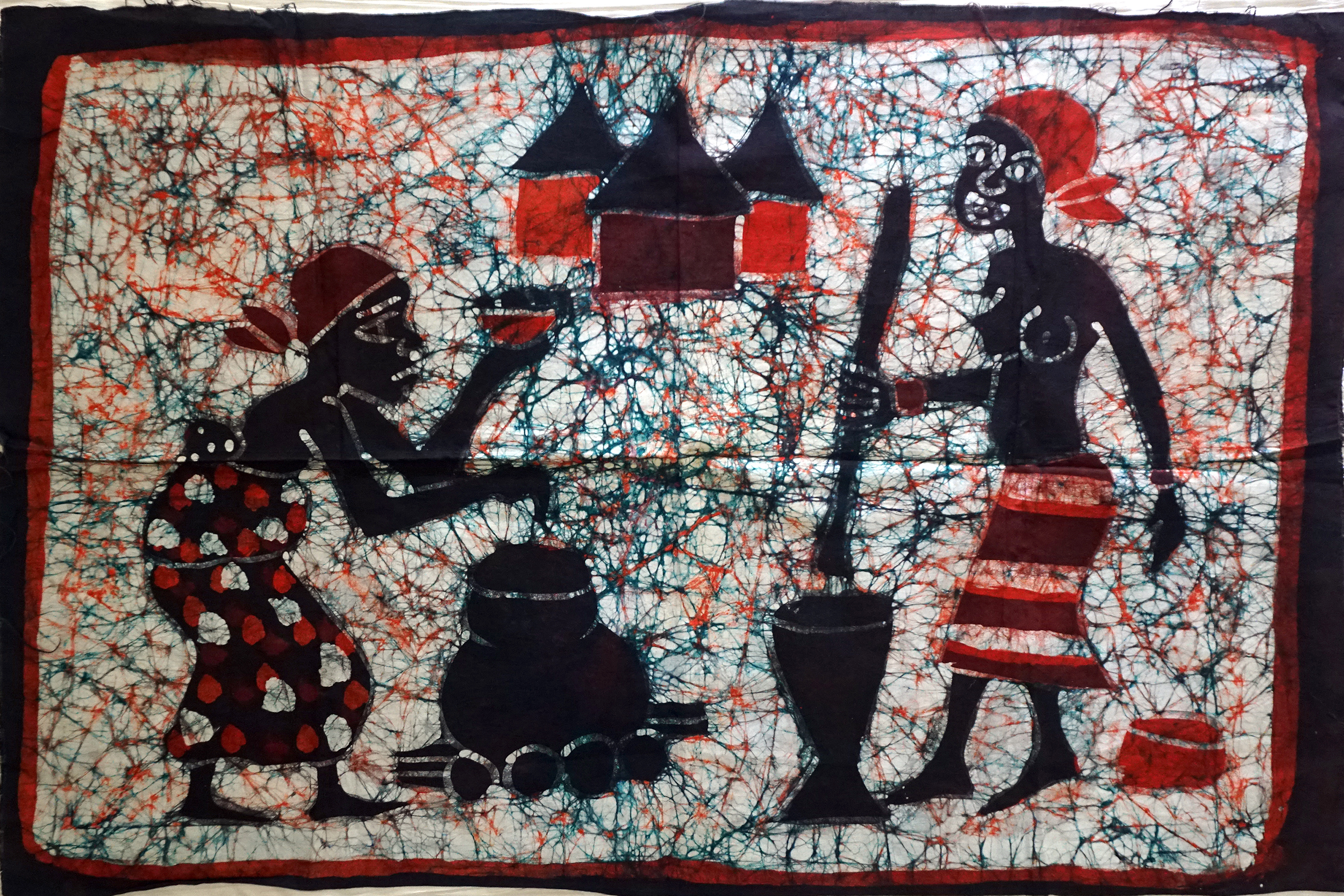 This item shows two women preparing food with village huts in the background. The image is in orange, green and black. One of the women has a baby on her back and is dropping food into a cooking pot. The other woman is pounding food in a mortar.