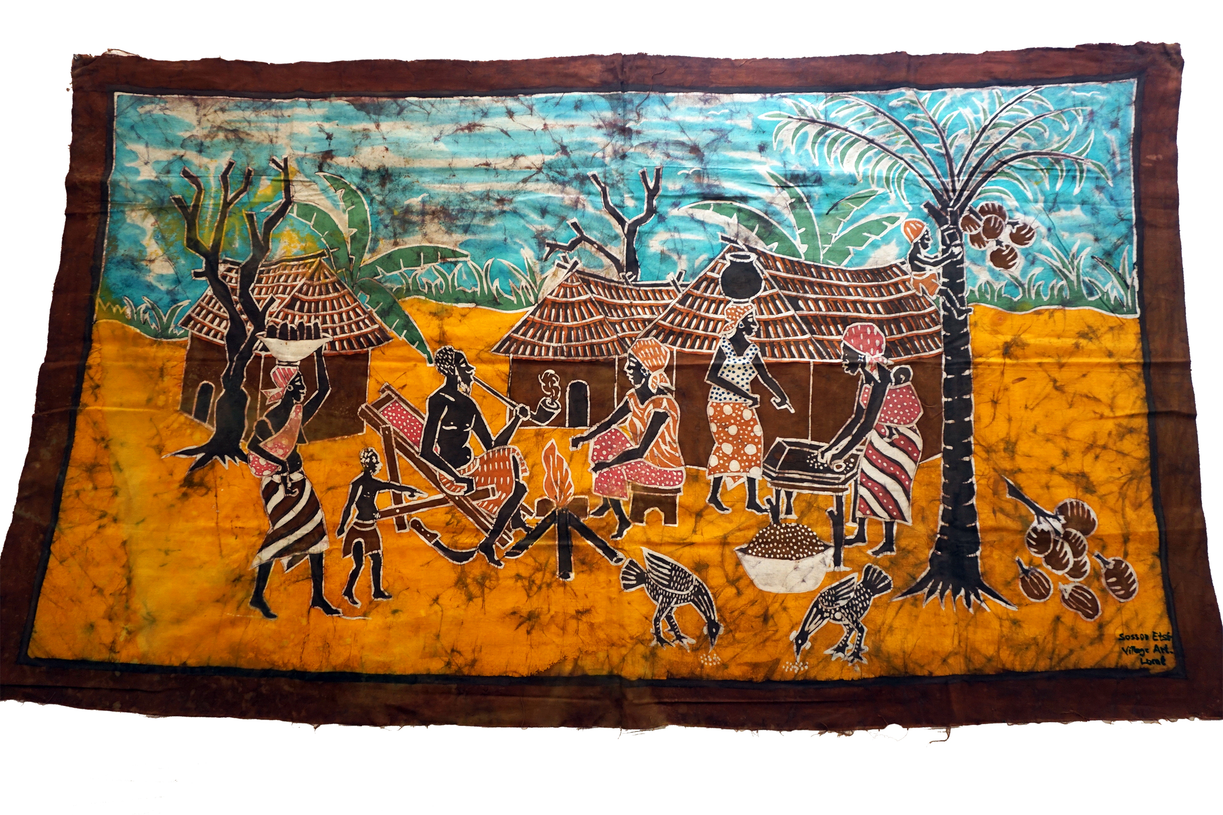 This item shows a village scene (three mud structures) with four women, presumed to be wives and one man, assumed to be the husband, in a chair smoking a pipe. A child and chickens are present in the yard as the women attend to chores. The primary colors depicted are blue for the sky, orange for the ground plus black, pink, white for the garments. One woman has a baby on her back