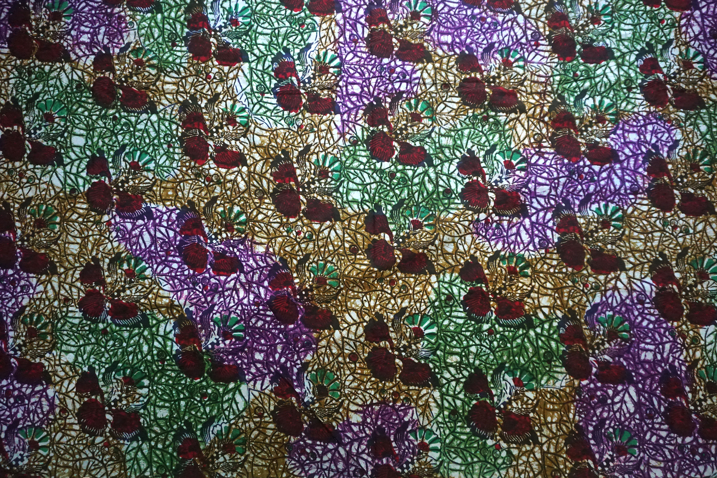 The cloth has a red, green and black plant design. It has been cut but never washed. The cloth is in good condition.