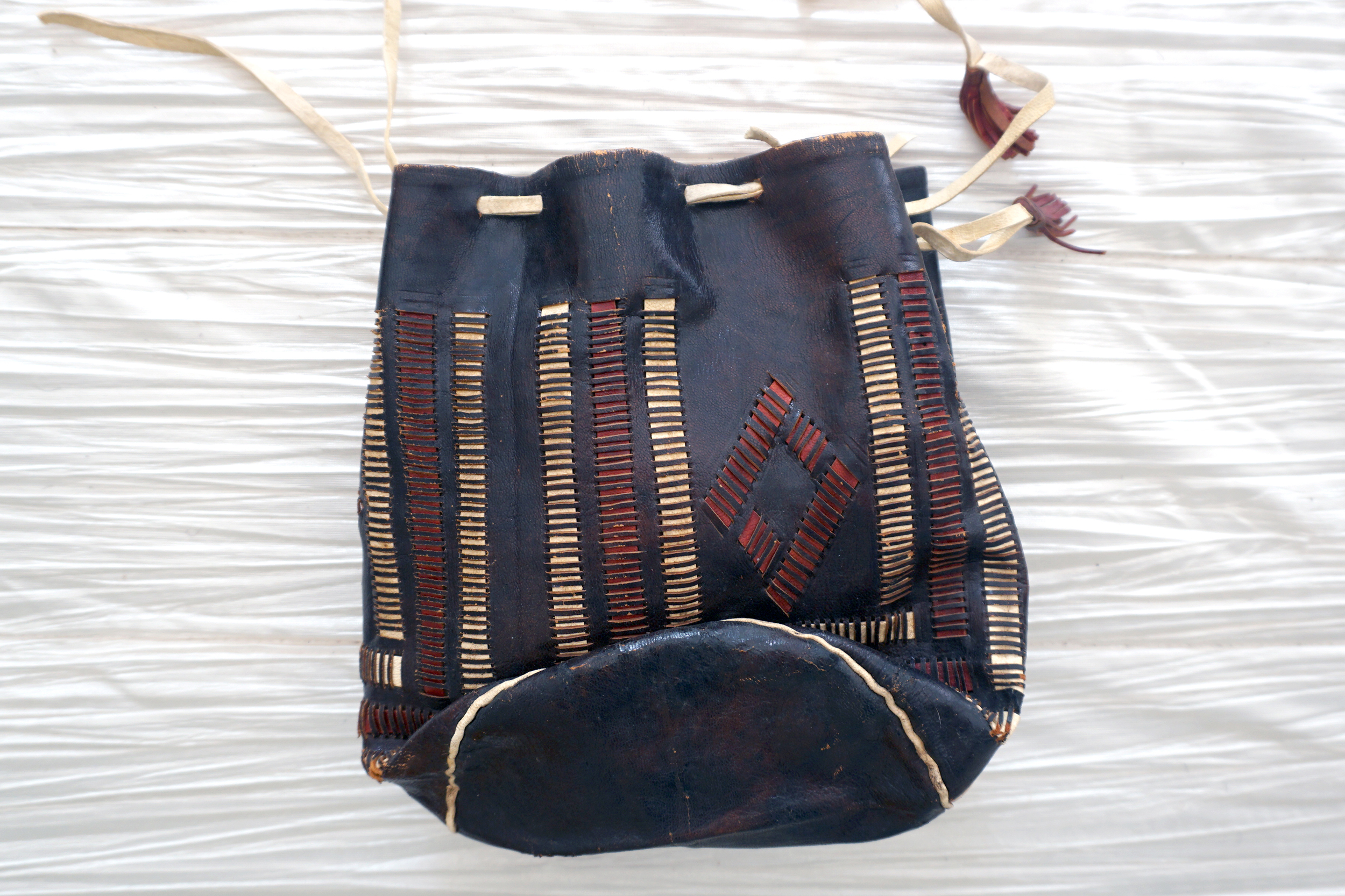 The western style black, red and natural purse with repeated lines and a diamond pattern is made entirely of leather. The purse has a natural leather drawstring with tassels on the ends of the drawstring. The small lines and the diamond shapes on the purse are interwoven strips of natural leather.
