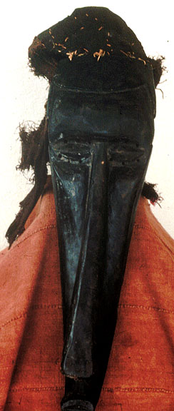 This wood mask, Nyimbiti or Nyiabita, is of attenuated form, with a darkened surface and attachments. Provenance: Kuba royal family
