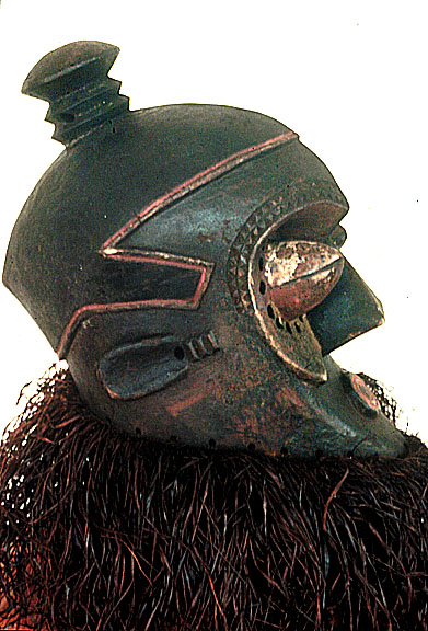 - This wood helmet mask has a crown projection, multiple eye piercings, painted areas, and fiber suspensions. Provenance: Kuba royal family