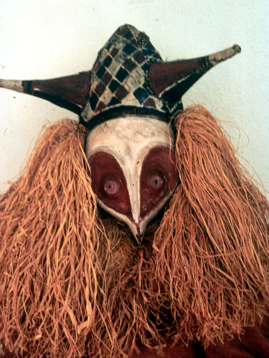 This wood mask has a tall crown, pigments, and abundant raffia.