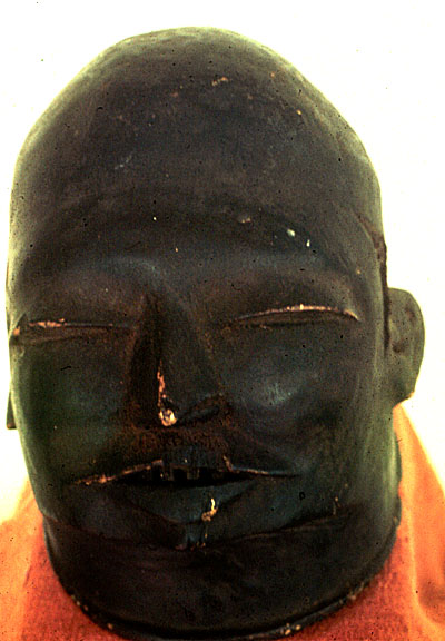 This wood helmet mask has traces of attached human hair and a darkened surface.