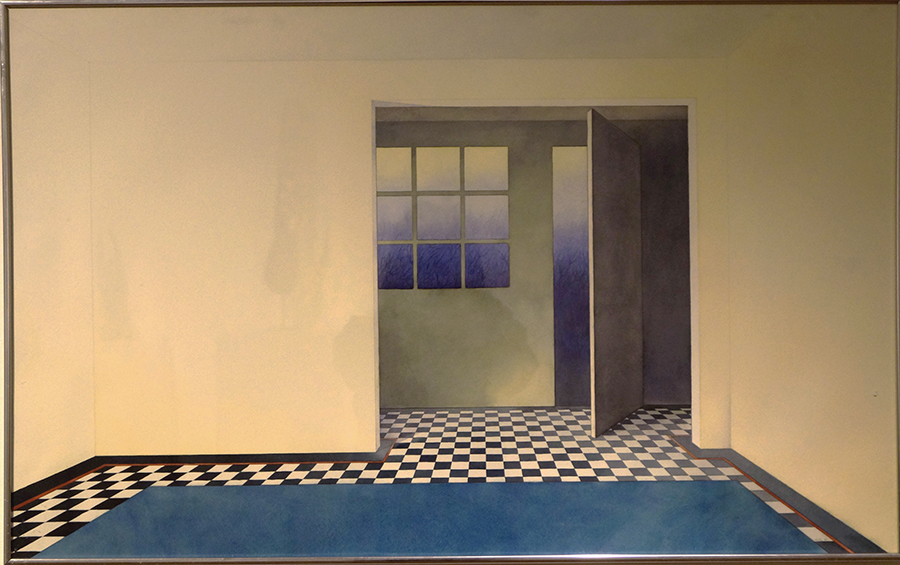 Empty white room, teal and checkered floor; door open; silver metal frame.