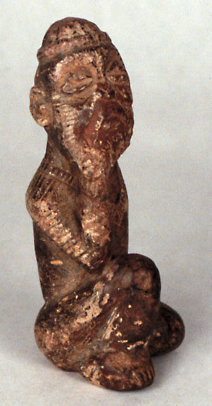 This stone Ntadi figure is kneeling, with hand to the chin.
