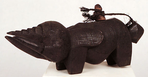 Made of wood, this "rubbing oracle" was used as a divination tool. The diviner rubbed the wooden attachment over the back of the animal figure. If it stuck, the person was guilty. "A crocodile never lies" was a local saying. (Fagg, 32, Pruitt lectu... This Itoombwa wood divination animal has tusks, a dentate body design, and darkened surface, and an accompanying rubbing implement.