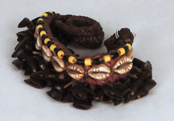 - This Kuba anklet is made of woven fiber, seed pods, cowrie shells, and glass beads.