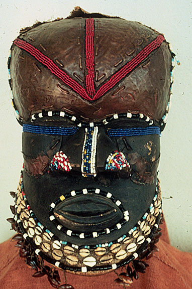 This wood helmet mask is decorated with copper, shells, and beadwork in blue, red and yellow.
